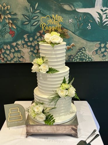 Delicious moist sponge filled and covered with a rich layer of buttercream, in the summer months a layer of white chocolate ganache may be added for stability, prices are for a round cake each tier at least 6” (115cms) tall 3 layers of sponge with 2 layers of filling.